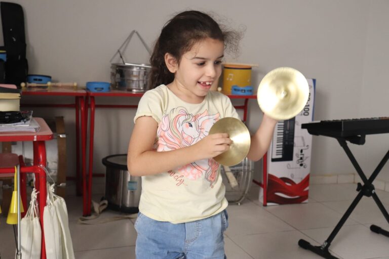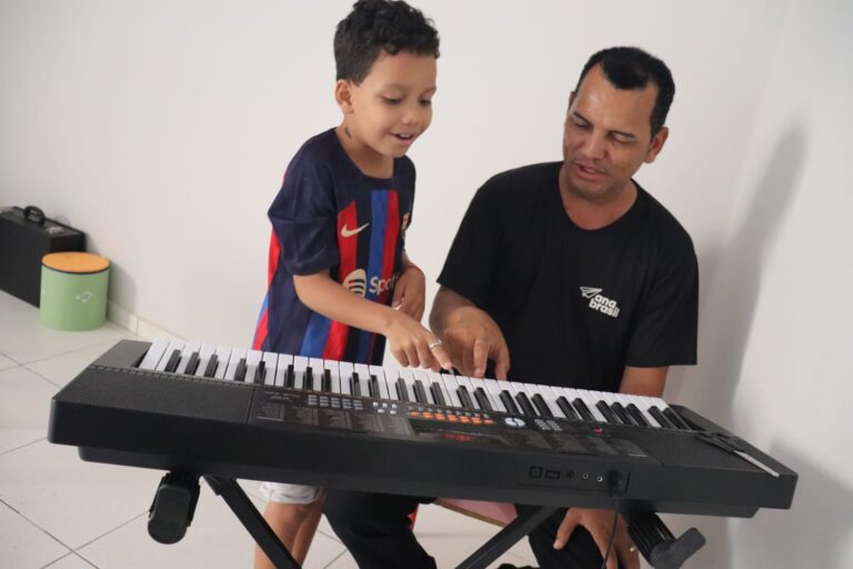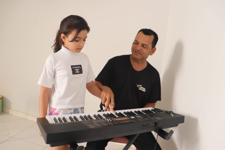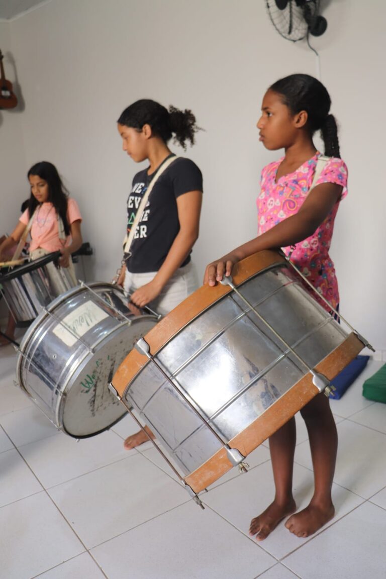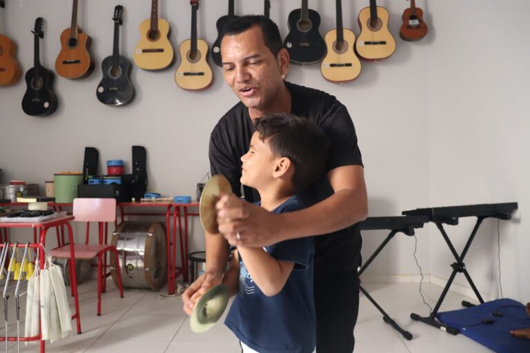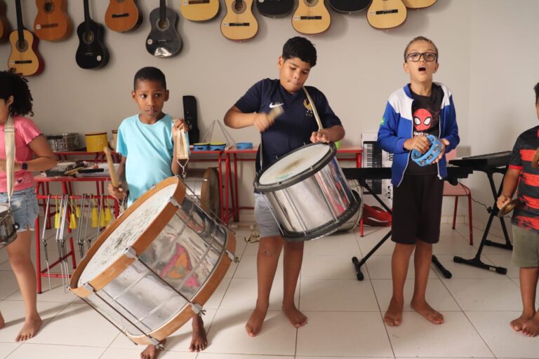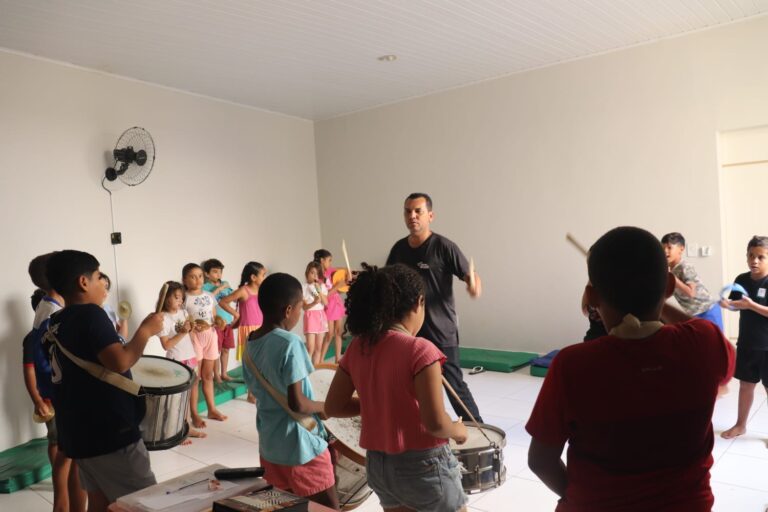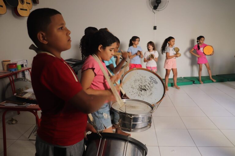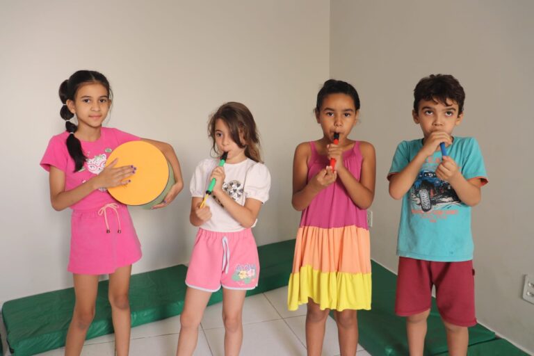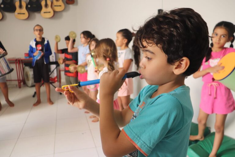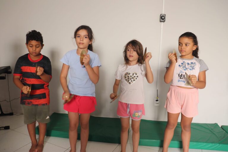 A aula envolveu iniciação musical com instrumentos de percussão, seguida pela criação de uma banda entre os alunos. Houve um desfile animado pela unidade com batuques e ritmos, encerrando com um jogo de memorização de notas musicais para reforçar o aprendizado de forma lúdica e interativa.