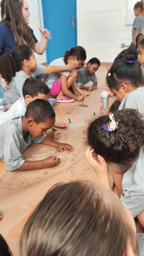Na turma de 6 a 8 anos, as crianças foram desafiadas a ilustrar a história que ouviram, contada por alunas voluntárias de Fonoaudiologia e Enfermagem da PUCC. Um momento de aprendizado, criatividade e encantamento! 🤓✨