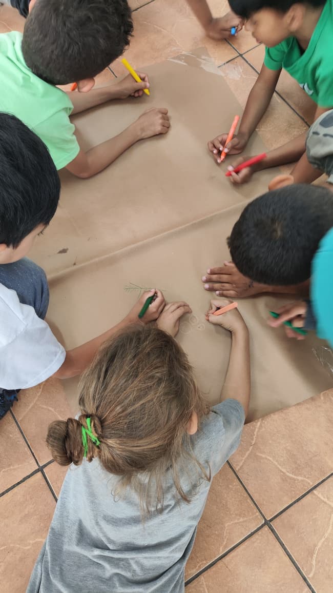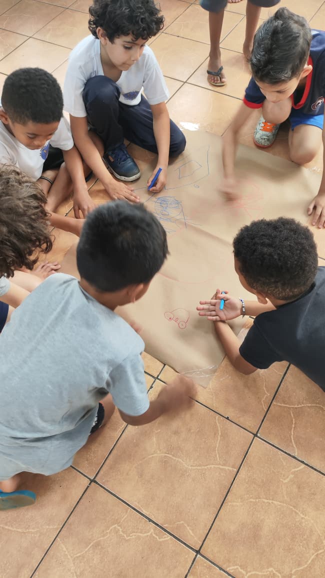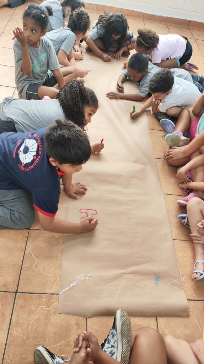 Na turma de 6 a 8 anos, as crianças foram desafiadas a ilustrar a história que ouviram, contada por alunas voluntárias de Fonoaudiologia e Enfermagem da PUCC. Um momento de aprendizado, criatividade e encantamento! 🤓✨