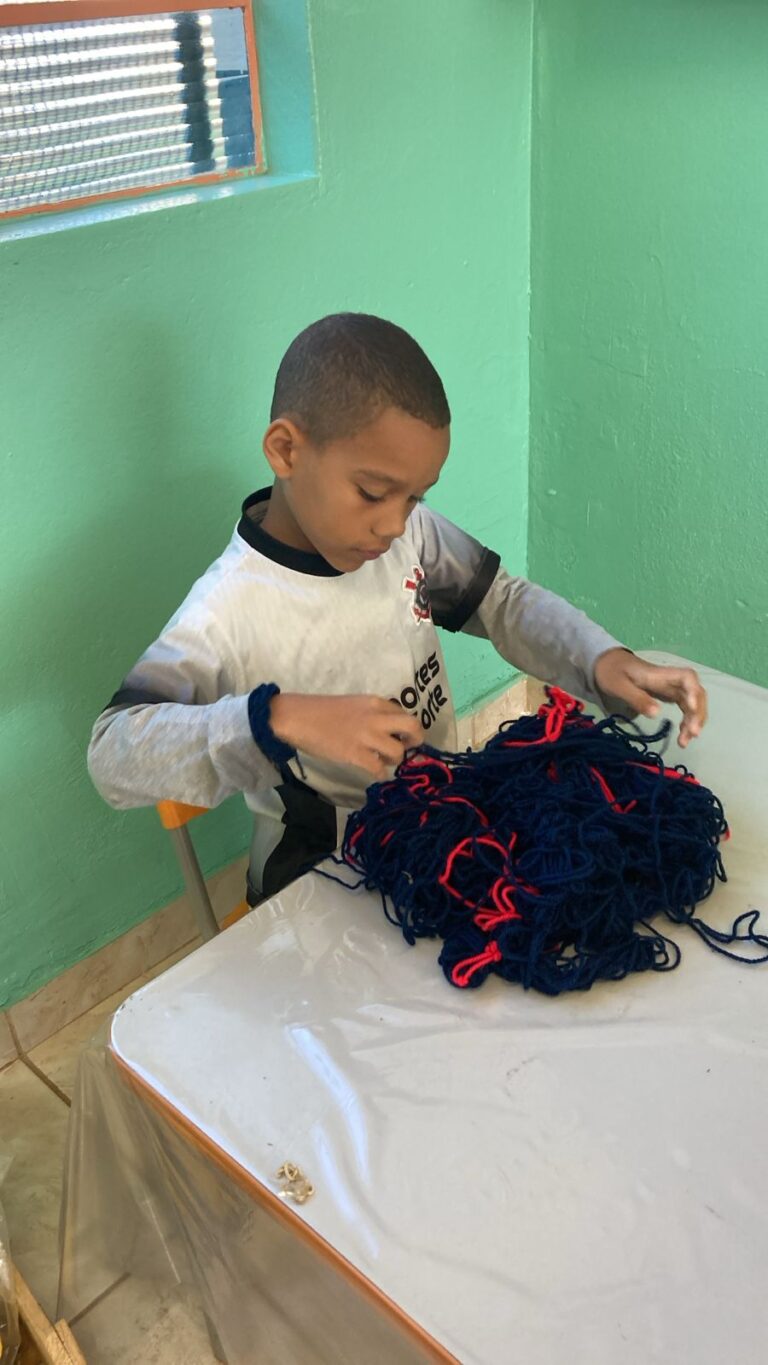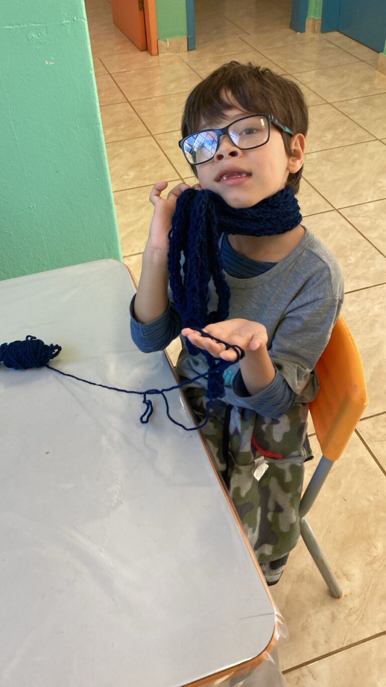 O frio chegou e a criatividade também! Na oficina de inverno, nossas crianças estão confeccionando cachecóis de tricô feitos à mão, desenvolvendo coordenação, paciência e muito carinho em cada ponto.